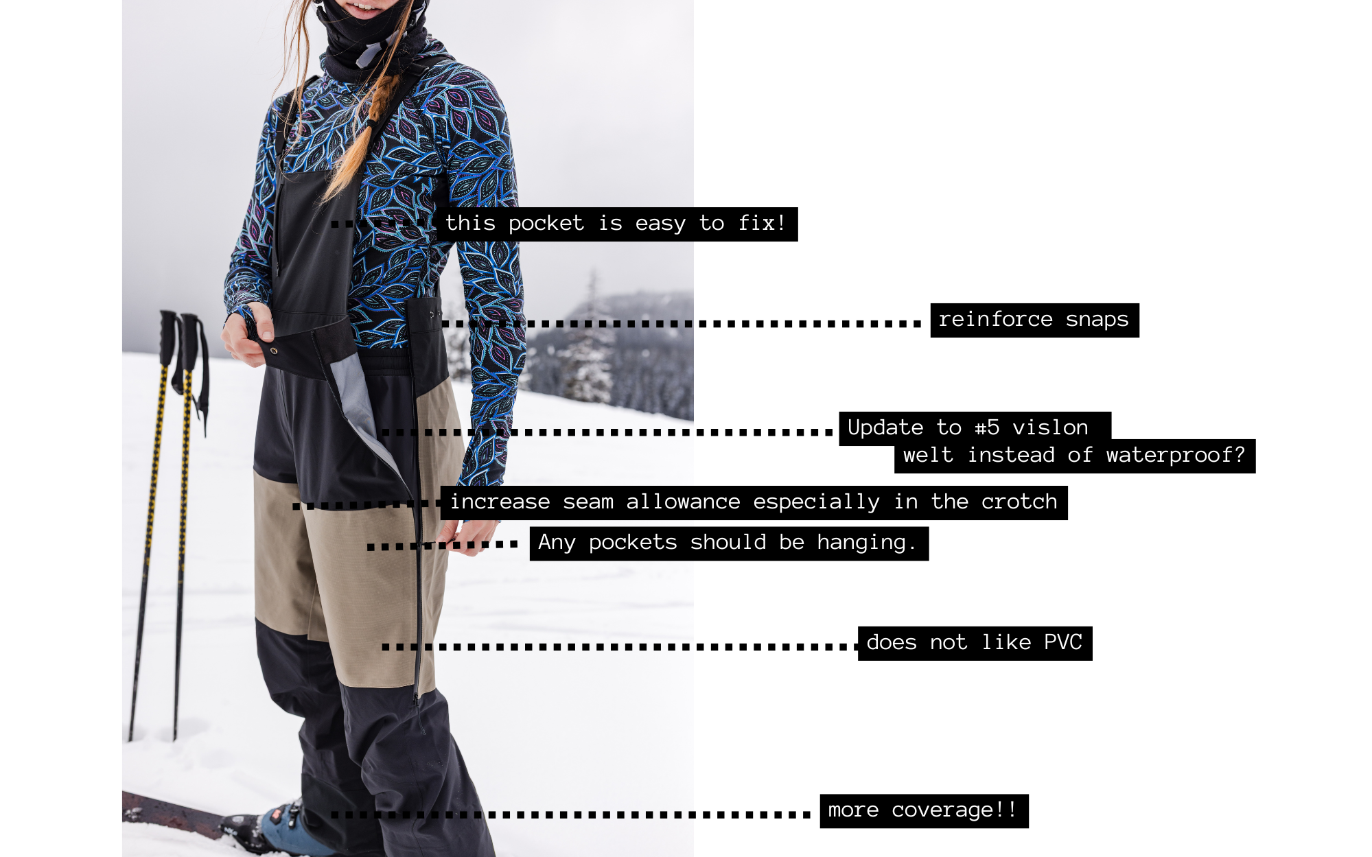 To fix this, we can increase side seam zipper to a #5 and update to waterproof Vislon. Vislon zippers see fewer repairs, and YKK now makes them with replaceable teeth, so you don’t have to replace the whole zipper if a tooth falls off. The use of welts, a fabric covering for zippers and pockets, triggers a lengthy conversation regarding sun exposure, waterproofing, and fabric failure, but was another topic Ruby and I covered. This is mentioned only to provide insight. There are so many considerations in making apparel that are not always realized from a consumer perspective.