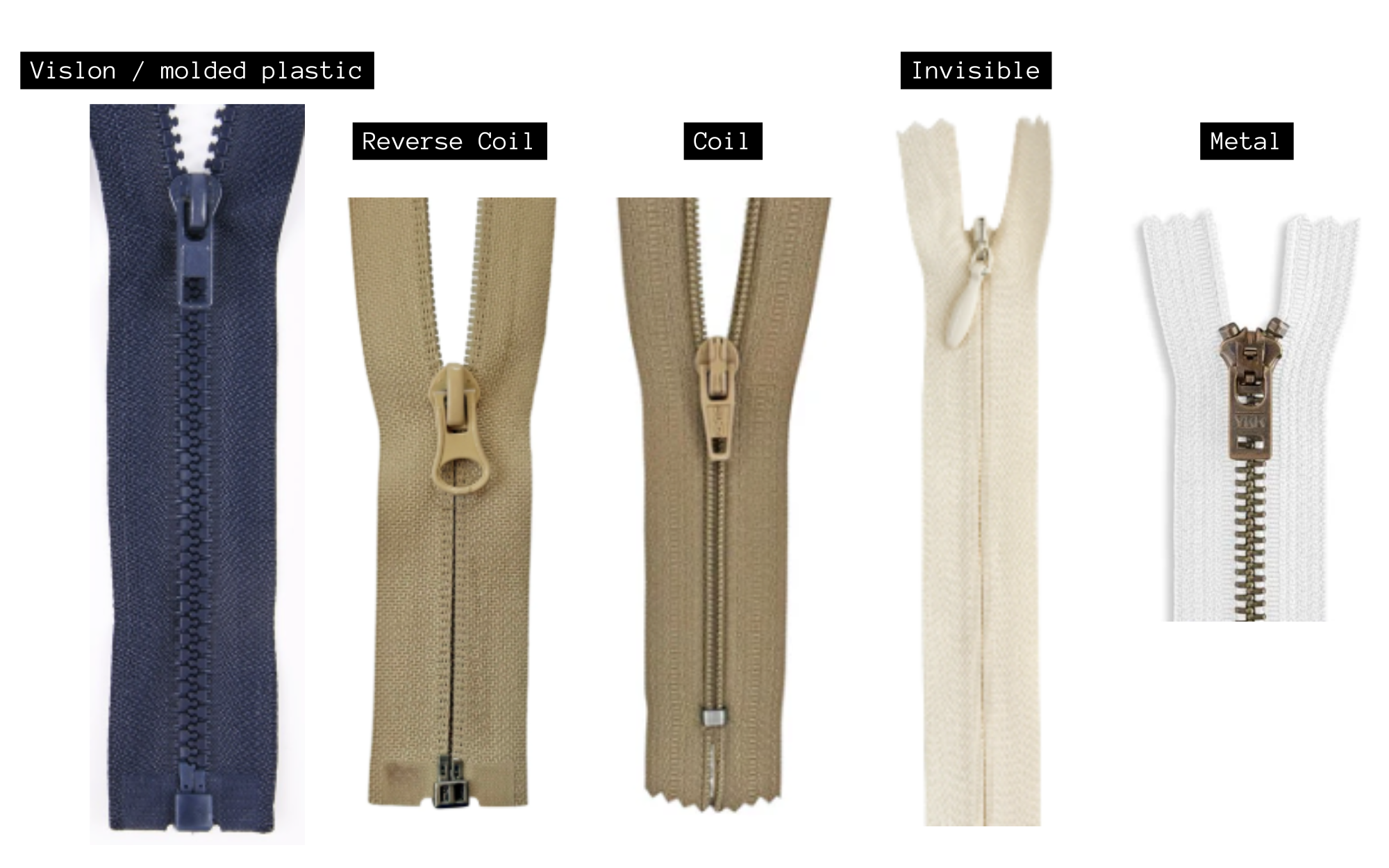 First, let’s do an abbreviated zipper lesson. The image below shows the types of zipper teeth. The types of zippers that can be made waterproof are Vislon and reverse coil. This is done by adding a coating of PU to the exterior zipper tape. A reverse coil is a coil zipper inside out. We also designate the size of the zipper using numbers to indicate width of teeth. Common sizes are: #3 = 3mm zipper, #4.5 = 4.5mm zipper, #5 = 5mm zipper.